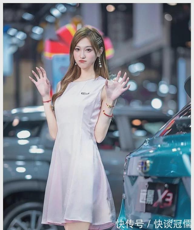 手指指向脑袋这种冥想这种想象显得女孩儿特别可爱粉粉的裙子站在车的旁边映照着裙子也特别的漂亮真是可爱极了。