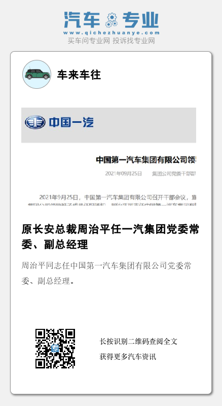 9月26日消息,据中国一汽官网透露,日前,中国第一汽车集团有限公司召开干部会议,宣布领导班子成员任职决定:根据中央组织部关于集团公司领导班子成员任职通知,周治平同志任中国第一汽车集团有限公司党委常委、副总经理。