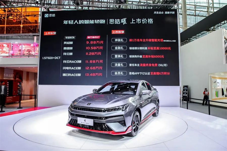11月19日,思皓乘用车携主力产品亮相广州车展,并隆重发布HOL-Pilot思皓智能驾驶技术,同时,智能轿跑—思皓曜正式上市。思皓曜共6款车型,官方指导价9.88-13.48万元,前1万名车主升级智能光源语(穿云版及以上车型)、瑞福德分期利息补贴至高10000元、增换购升级至高补贴6000元、首任车主流量终身免费(5G/月)、思皓APP下订认证至高赠6万积分。