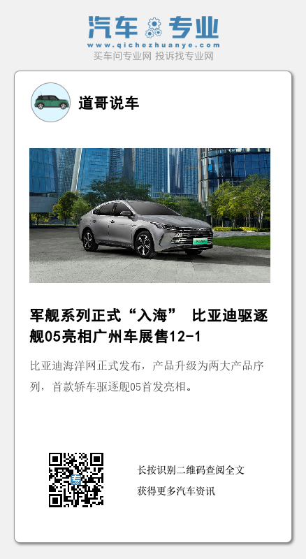11月19日,2021广州车展正式开幕,在本届车展上,比亚迪海洋网正式发布,产品升级为两大产品序列,首款轿车驱逐舰05首发亮相。据悉,驱逐舰05将采用DM-i超级混动技术以及刀片电池等核心技术,价格区间将介于12万元-15万元之间。