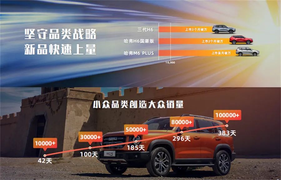 具体车型方面,第三代哈弗H6和哈弗H6国潮版均做到了上市2个月销量破万,哈弗M6 PLUS上市首月就月销破万,成为家用SUV首选;哈弗大狗上市383天销量突破10万,完成了造车新势力三年的KPI,成功开辟了城市轻越野SUV的新赛道,在小众品类中创造了大众销量。