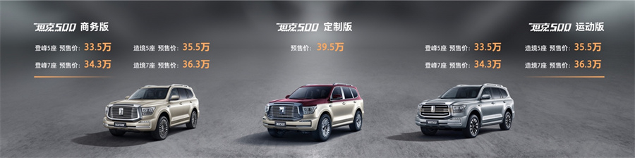 其中,坦克500在广州车展正式开启全国预售,共推出商务版、运动版及定制版三个版本,同时提供5座、7座车型可选,预售价格为33.5万元-39.5万元。同时,与用户共创的坦克500黑武士版本同步开启预售,预售期限量发售500台,预售价格为36.5万元。针对预售订购用户,坦克品牌还推出了惊喜4重礼,以及6项限量福利政策。