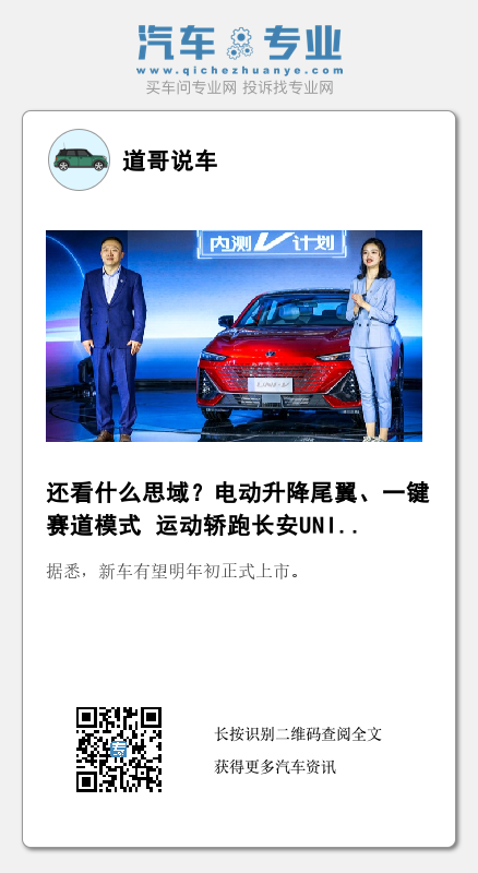 为了进一步满足消费者需求,11月21日,UNI系列的第三款车型,也是UNI系列的首款轿车——“未来科技运动轿跑”UNI-V也终于正式登场。新车基于长安最新平台技术的方舟架构打造,采用UNI家族经典设计语言并配备了同级唯一的电动升降尾翼,带来了极致的感官体验。据悉,新车有望明年初正式上市。