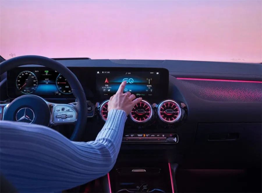 全新EQA搭载双10.25英寸的横贯式高清触控大屏,提供4种主题可选。其搭载极具创新性的MBUX智能人机交互系统,具有众多EQ专属功能,如EQ优化导航、气候预控制功能等。
