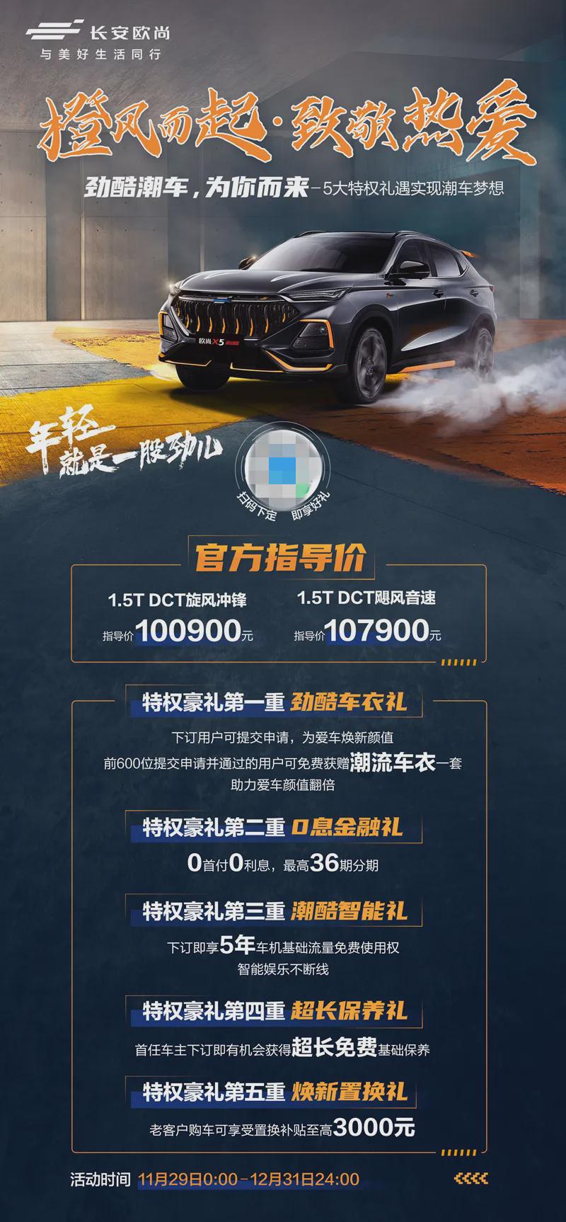 为了进一步为年轻人带来运动激情的个性风范,时隔一周年,2021年11月29日长安欧尚X5再次升级,带来了更为“橙力四射”的长安欧尚X5运动版,新车共推出1.5T DCT旋风冲锋和1.5T DCT飓风音速两款车型,指导售价分别为10.09万元和10.79万元。与此同时,官方还推出了包括“劲酷车衣礼”、“0息金融礼”、“潮酷智能礼”、“超长保养礼”、“焕新置换礼”在内的限时五大特权礼(11月29日0:00—12月31日24:00订车的用户),助力年轻用户实现潮车梦想。