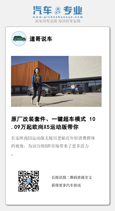 活力四射的视觉享受、丰富的智能科技配置、激情澎湃的驾驶乐趣,长安欧尚X5运动版无疑以更贴近年轻消费群体的视角,为10万级SUV市场带来了更多活力。新车上市后,也必将与长安欧尚X5组成更为完整的产品矩阵,为年轻消费者提供更具价值的购车选择。