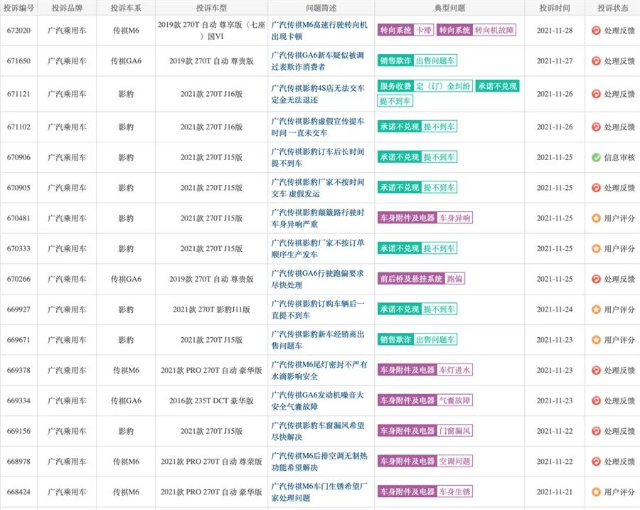 种种问题,放在一款才上市四个月,用户基础尚不丰厚的车型上真的正常吗?值得一提的是,广汽传祺引以为傲的影豹订单居然也成为了消费者吐槽的一环。《道哥说车》编辑注意到,在第三方汽车投诉网站中,出现了大量关于“厂家不按规定时间交车”的投诉。诚然,“芯片供应”是年内车企遇到的共性问题,交车压力大在所难免,可影豹搞“特殊待遇”又是怎么回事?