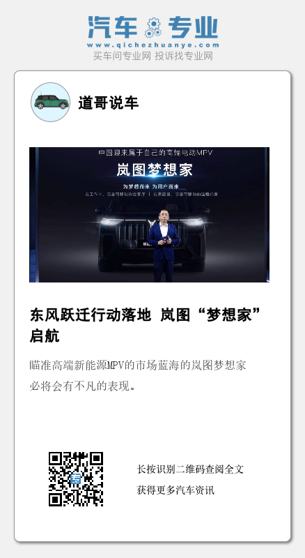 每个人都有梦想,每个人也都有一个梦想中的移动空间,其实从“梦想家”的命名来看,我们就能看到这款车背后所承载的“梦想”。作为汽车央企国家队,东风公司承载着建设汽车强国的重任,肩负着推动民族品牌向上的使命。岚图作为东风探索中国品牌发展新模式、推动民族品牌向上的最佳实践,不断打造国货新标杆,引领中国汽车产业转型升级,为新中坚的美好生活赋能,正是岚图背后的梦想。