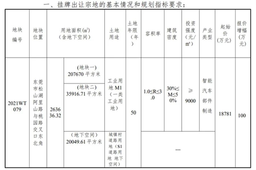 “华为不造车”,这句话不知道华为强调了多少遍,但华为在汽车行业内的热度却越来越高。近日,华为以1.88亿元竞得东莞松山湖26万平方米工业用地,东莞市公共资源交易网信息显示,华为竞得的该地块编号为2021WT079,面积为26.36万平方米,位于东莞市松山湖阿里山路与桃园路交叉口东北角,产业类型归属为“智能汽车部件制造”。同时,东莞松山湖高新区项目投资效益协议合同书显示,该项目投资总额不低于24亿元。