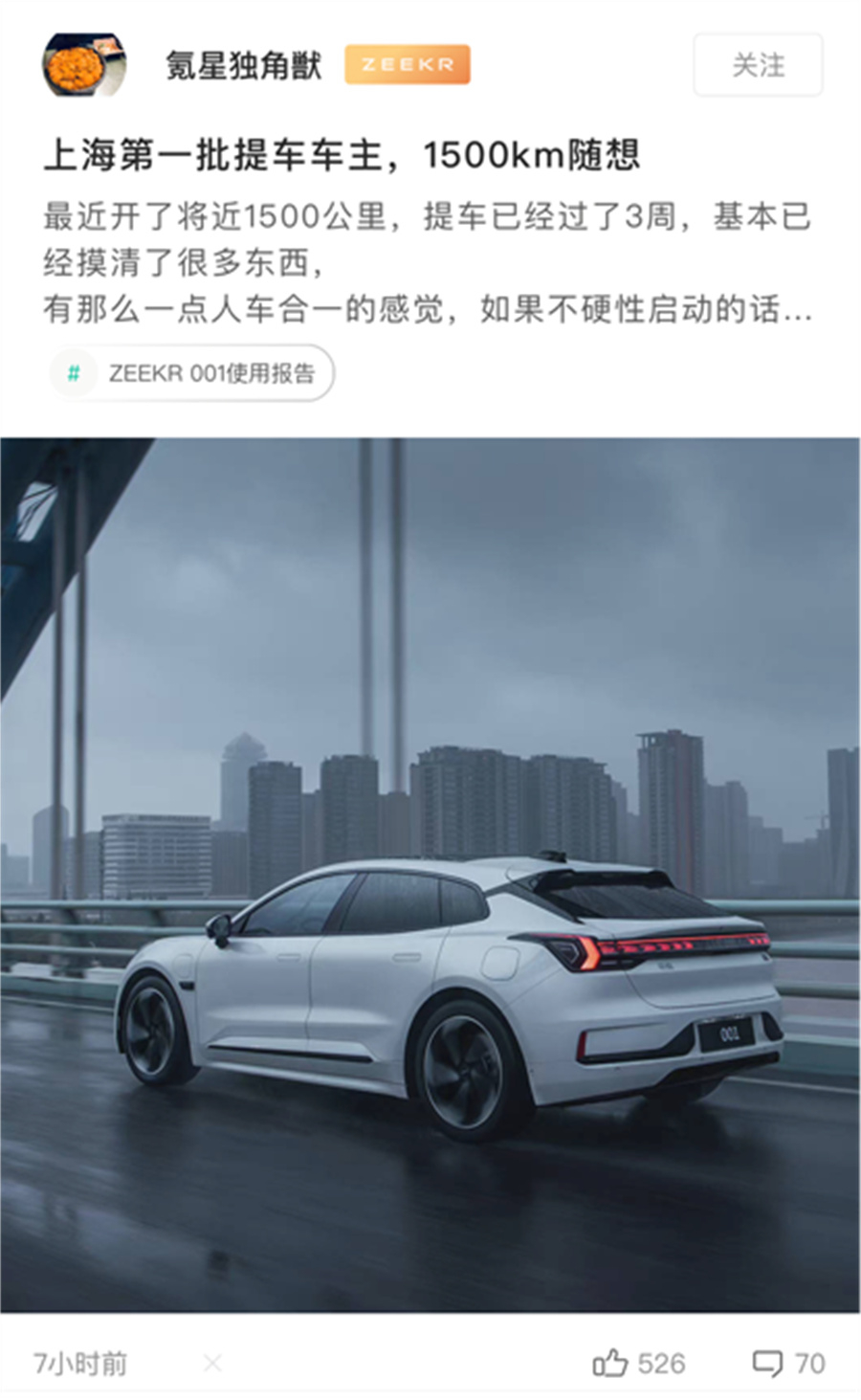作为用户型企业,极氪始终围绕用户打造生态体系,坚持与用户共创。作为链接用户的重要平台,极氪APP自6月30号上线至今,已更新了30多个版本,吸引了超过53万用户注册,累计互动超过230万次,现最高日活用户超过10万,产生用户共创建议1300条。其中随着ZEEKR 001交付开启,已拥车的金标用户积极发布提车体验,分享用车实用攻略。