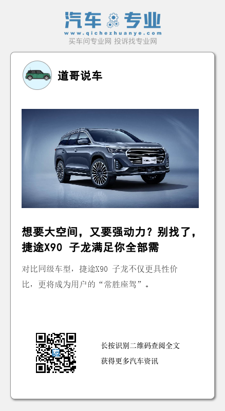 随着我国二胎、三胎政策的全面开放,车辆空间成了多口之家的用车刚需。能满足大空间需求的车型不再少数,但若搭载2.0T发动机与丰富的智能娱乐配置的合资品牌产品,动辄二三十万的售价往往让人却步,而作为捷途汽车的首款旗舰级中型SUV——捷途X90 子龙,不仅能满足家庭用车的空间需求,还能凭借澎湃的动力表现,解锁用户多元出行场景,且售价仅为15万元左右。