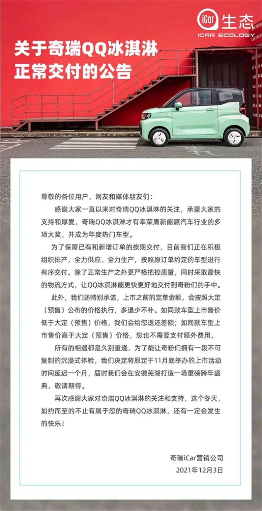 万众瞩目的奇瑞QQ冰淇淋并没有在11月底与消费者如期见面,根据奇瑞官方消息,奇瑞方面正在积极组织排产,全力供应、全力生产,按照原订单约定的车型进行有序交付。而原定于11月底举行的上市活动将推迟一个月。