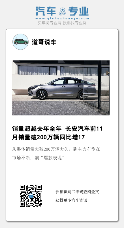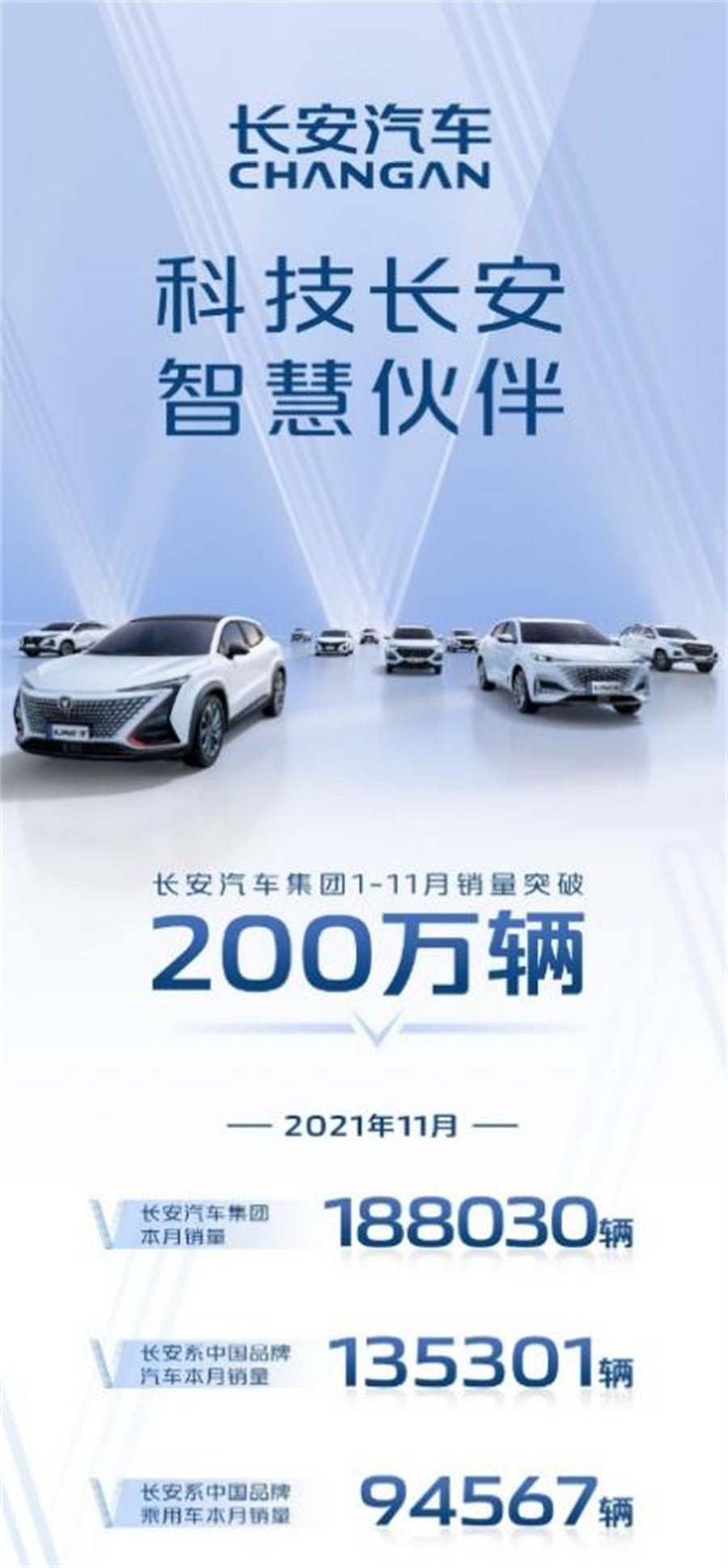 12月9日,长安汽车对外公布企业11月销量数据。数据显示,在11月销售188030辆后,长安汽车今年1—11月整体销量2122511辆,同比增长17.7%。在整体销量突破200万辆大关的同时,长安汽车今年销量超越去年全年。