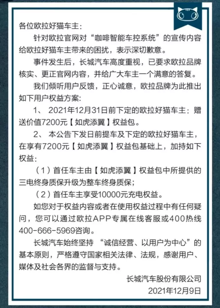 12月9日,长城欧拉汽车再度发表声明,称针对欧拉官网对“咖啡智能车控系统〞的宣传内容给欧拉好猫车主带来的困扰,表示深切歉意。事件发生后,长城汽车高度重视,已要求欧拉品牌核实、更正官网内容,并给广大车主一个满意的答复。
