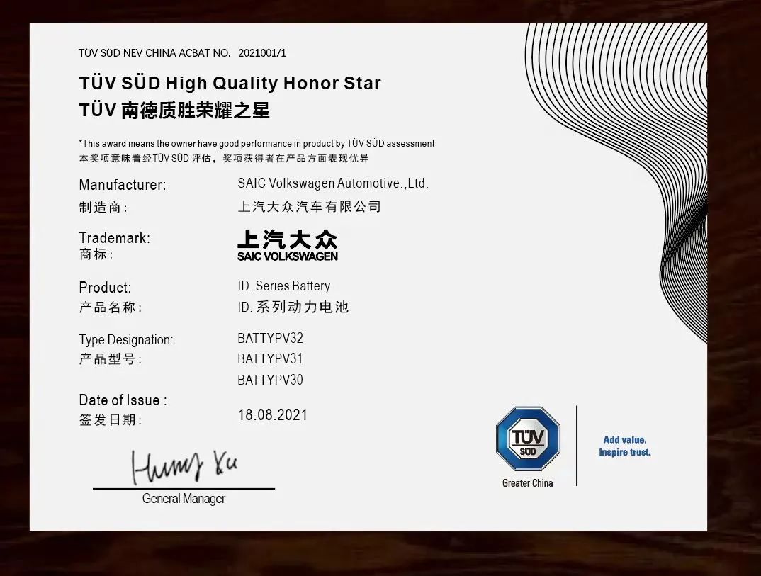 11月,TÜV南德意志大中华集团向上汽大众颁发“TÜV南德质胜荣耀之星”证书,认证ID.系列动力电池在可靠性、耐用性、安全性上的优异表现。上汽大众及其电池产品是TÜV南德该奖项在国内的首个获奖者。