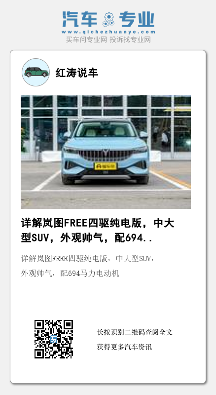 新能源汽车技术日益成熟,越来越受到广大消费者的认可,而今天红涛要说的这款中大型SUV,出自东风汽车集团旗下的高端智能电动品牌,整体实力很强,它就是岚图FREE(图片|配置|询价) 2021款 四驱纯电版专属豪华套装车型,下面就让我们一起来看看它的各方面表现到底怎么样。