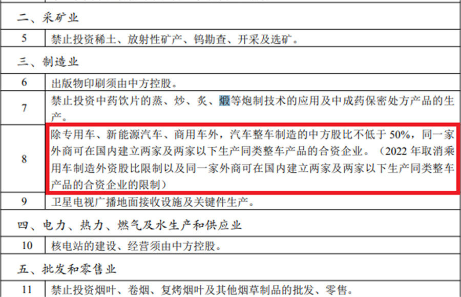《道哥说车》编辑注意到与上一版相比,新的负面清单中取消了乘用车制造企业中外资占股比例的限制,以及同一家外商开办整车产品合资企业数量的限制。这一举措的落地究竟有何意义?