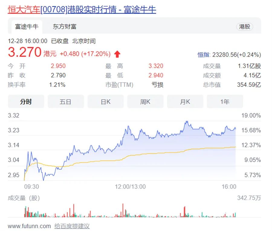 距离2021年结束还有3天的时间,恒大汽车股价一日拉升17.2%,盘中最高涨幅达到19%。与此同时,恒大系概念股也纷纷上涨,包括中国恒大、恒大物业等均有较大涨幅,一时间,恒大系企业仿佛迎来春天。