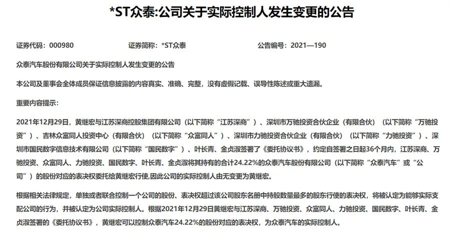 12月29日晚间,众泰汽车发布“关于实际控制人发生变更的公告”,据公告内容,黄继宏与江苏深商、万驰投资、众富同人、力驰投资、国民数字、叶长青、金贞淑签署了《委托协议书》,约定自签署之日起36个月内,以上7位股东将其持有的24.22%众泰汽车的股份对应的表决权委托给黄继宏行使,公司的实际控制人因此变更为黄继宏。