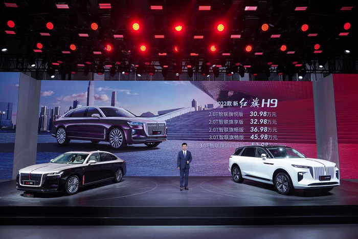 在2021年11月的广州国际汽车展览会上,新红旗公布了旗下最为重要的旗舰产品——H9和E-HS9的焕新和升级。在2022款H9中,新红旗为客户实现了多达23处焕新升级,让这款大受欢迎的国产C+级豪华轿车标杆之作,继续稳固其领先同级的实力和地位。在全新推出的E-HS9 120度电池增长续航版产品中,这款包含564项专利、代表红旗量产车型最顶级技术的集大成之作,增加了120千瓦时的高容量电池、NEDC续航里程最高达690公里,回应了客户对出行无忧的强烈需求。2021年6月,E-HS9成功挑战国内首次公开双侧柱碰测试,完美展现了产品电池安全和乘员安全强大实力;在10月“C-NCAP十五周年——全球首次公开双车高速追尾碰撞测试”、12月“C-NCAP五星安全评价”中,H9也以强大的主动安全、被动安全和乘员安全防护,向客户证明了新红旗旗舰产品的国车安全水准。