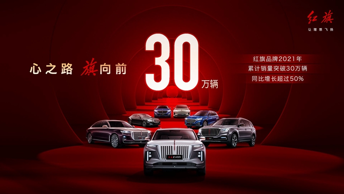 2021年,中国汽车业在大步迈入“十四五”开局之年、迎接“双碳”新时代和变革新机遇的同时,也遭遇了疫情反复侵袭、芯片供应短缺和极端天气等严峻挑战。在这机遇与挑战并存的一年行将结束之际,30万销量的达成,宣告了新红旗已经创造出4年销量增长63倍的产业旗迹,再次奏响了民族汽车品牌铿锵激昂的最强音。