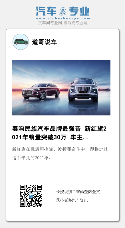 12月31日,新红旗品牌官方宣布:2021年12月,新红旗以超过39100台的月销量,再次刷新单月销量纪录;2021全年销量突破30万台,同比增长超过50%,增速10倍于行业平均水平,撞线品牌销量崭新里程碑。尤其是,新红旗产品矩阵的两款旗舰车型——红旗H9和红旗E-HS9,分别以全年突破40000台和5400台的成绩,在各自市场同级产品中居于前列,成为新红旗占位自主豪华汽车品牌的引航者。