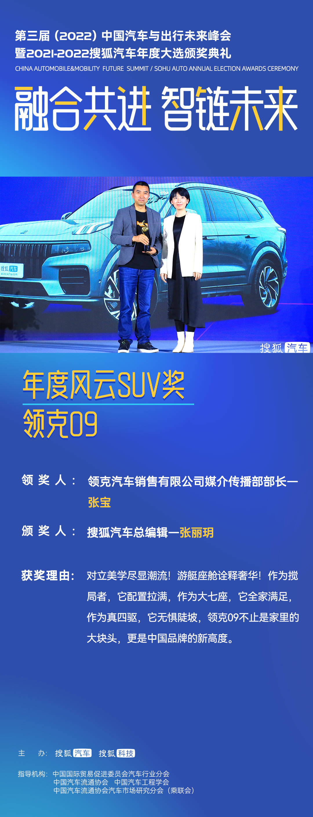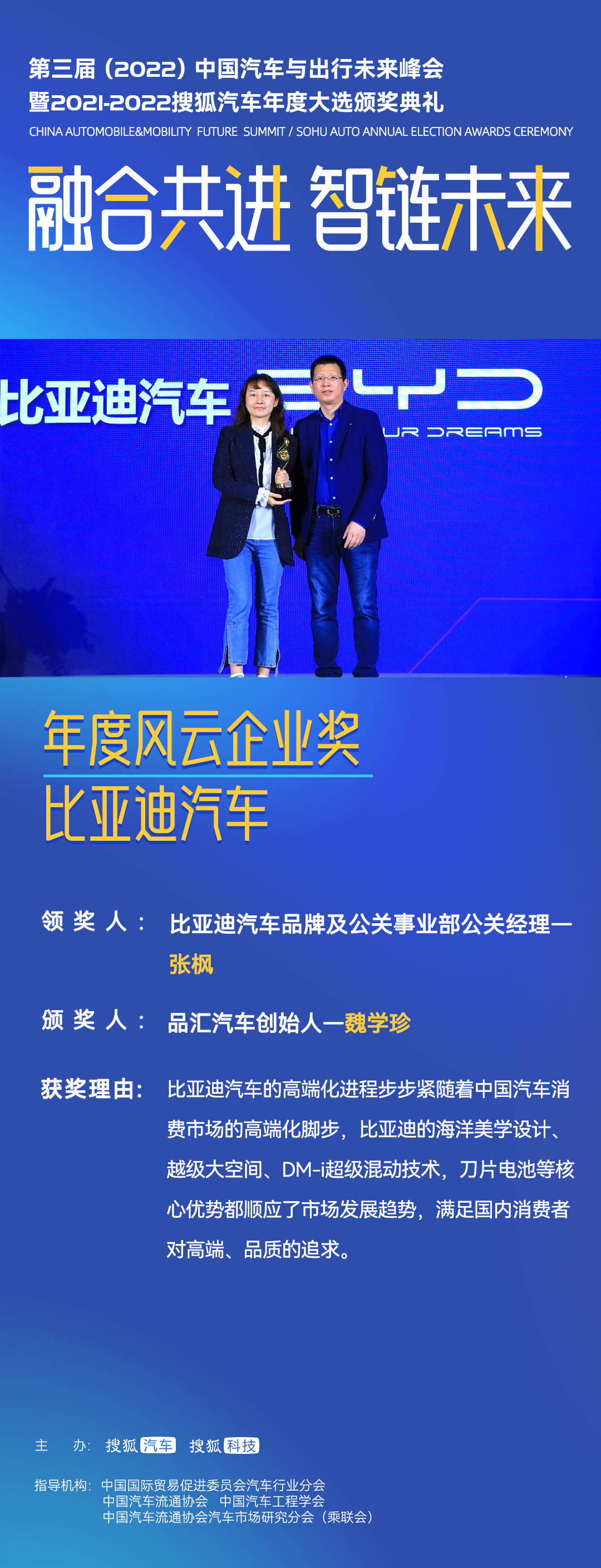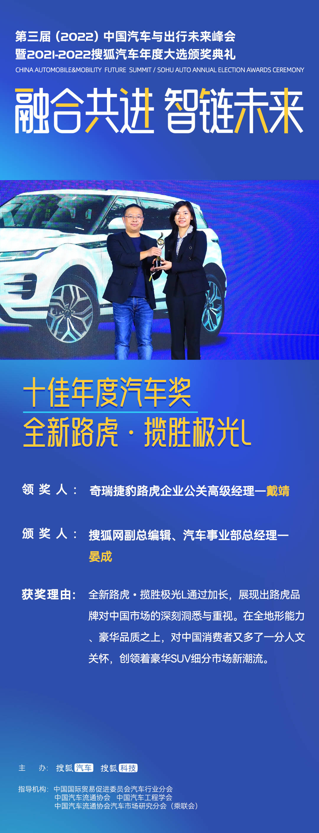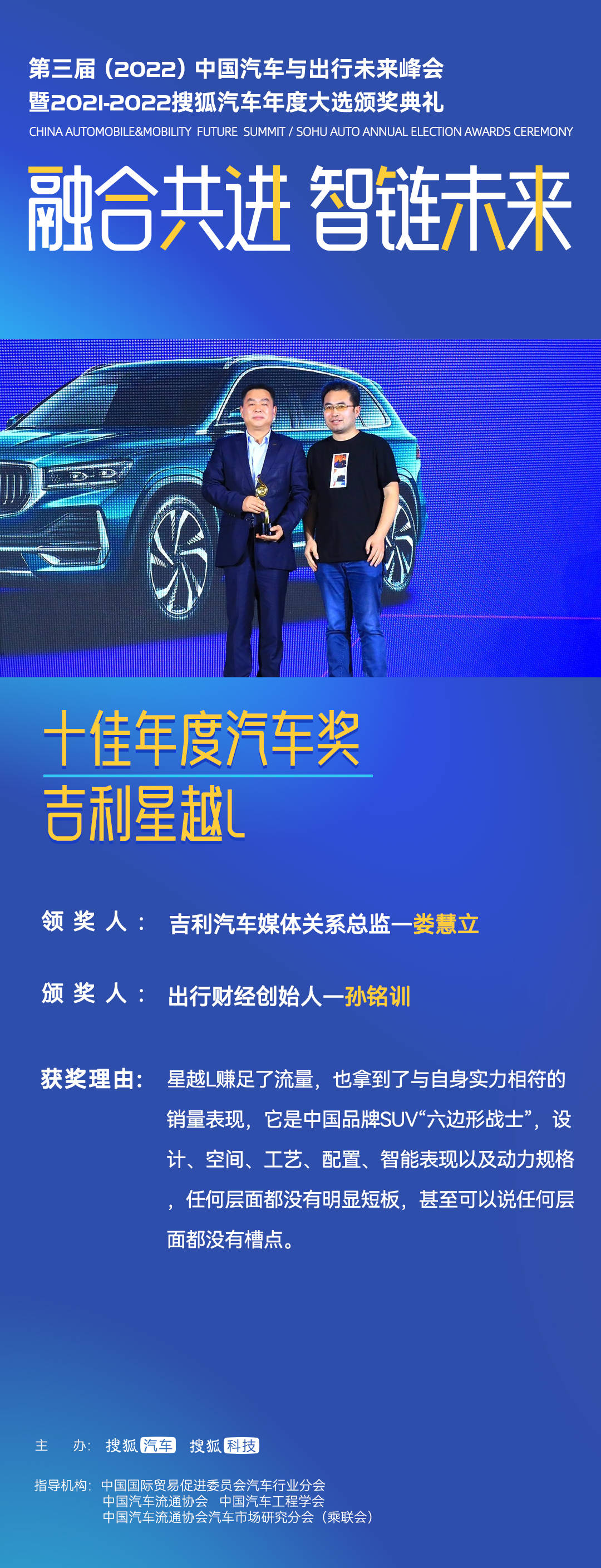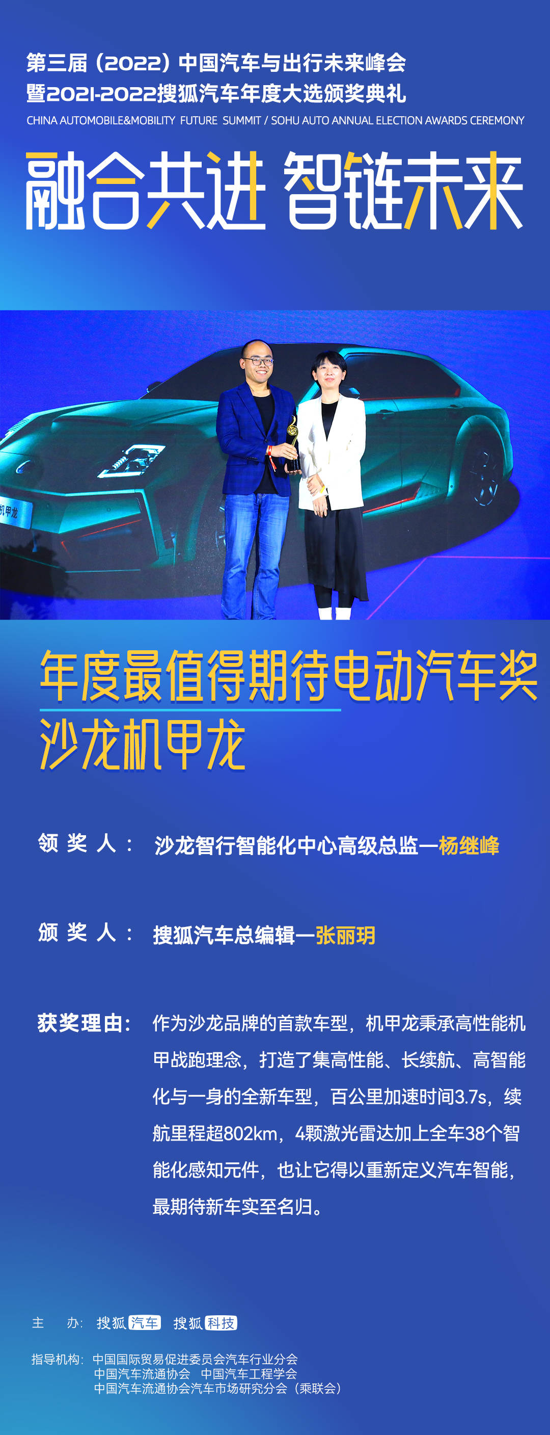 未来,“搜狐汽车年度大选”奖项将继续凭借专业的评审团队、全面的数据支撑以及极高的网友参与度,持续打造中国汽车行业最具影响力、最具权威性、最具指导价值的年度车型评选活动。大选将继续以优秀的企业与产品为载体,标记时代变革,持续见证中国汽车产业发展的历史进程!以下为“2021-2022搜狐汽车年度大选”获奖名单。
