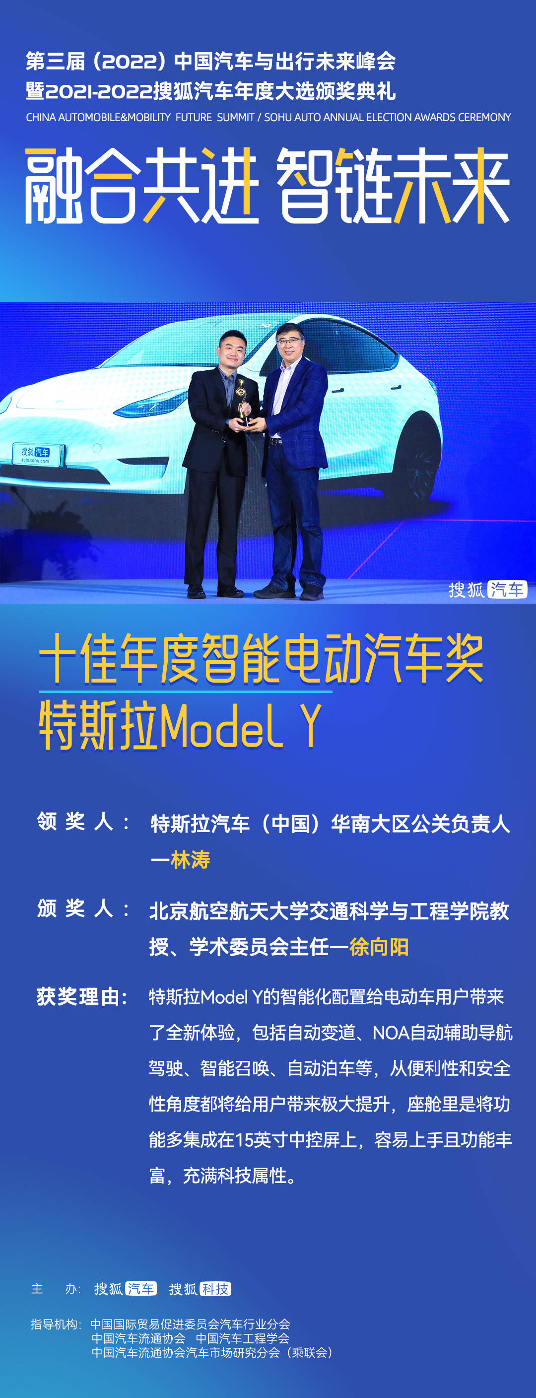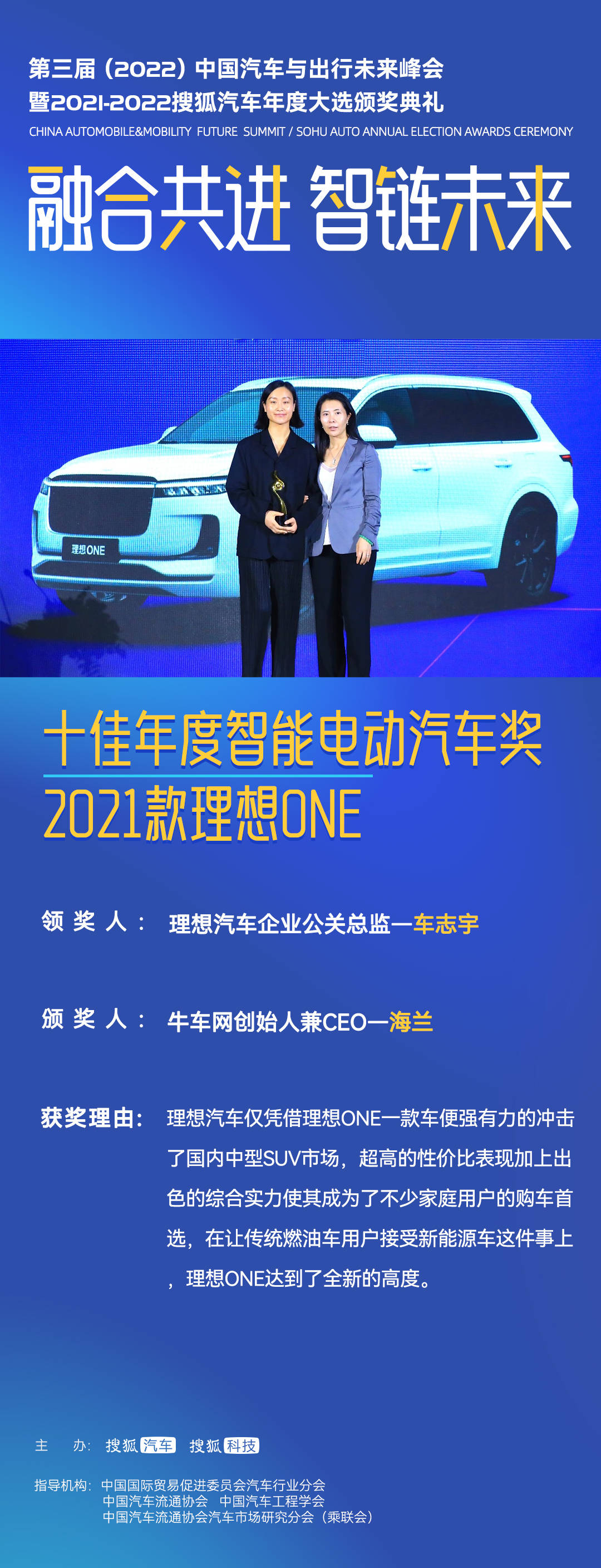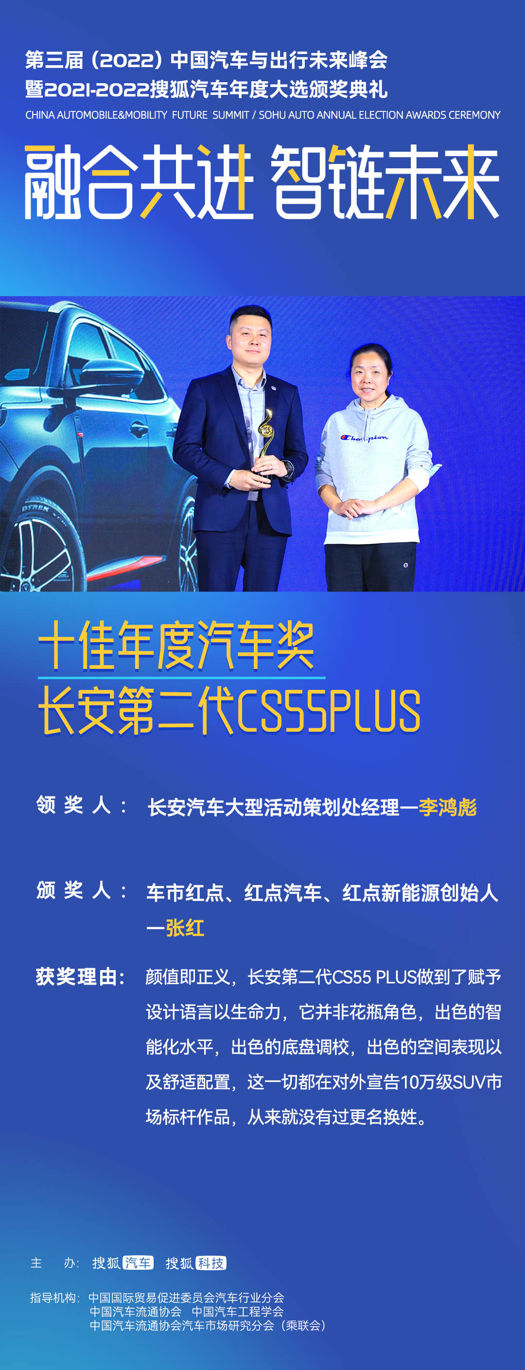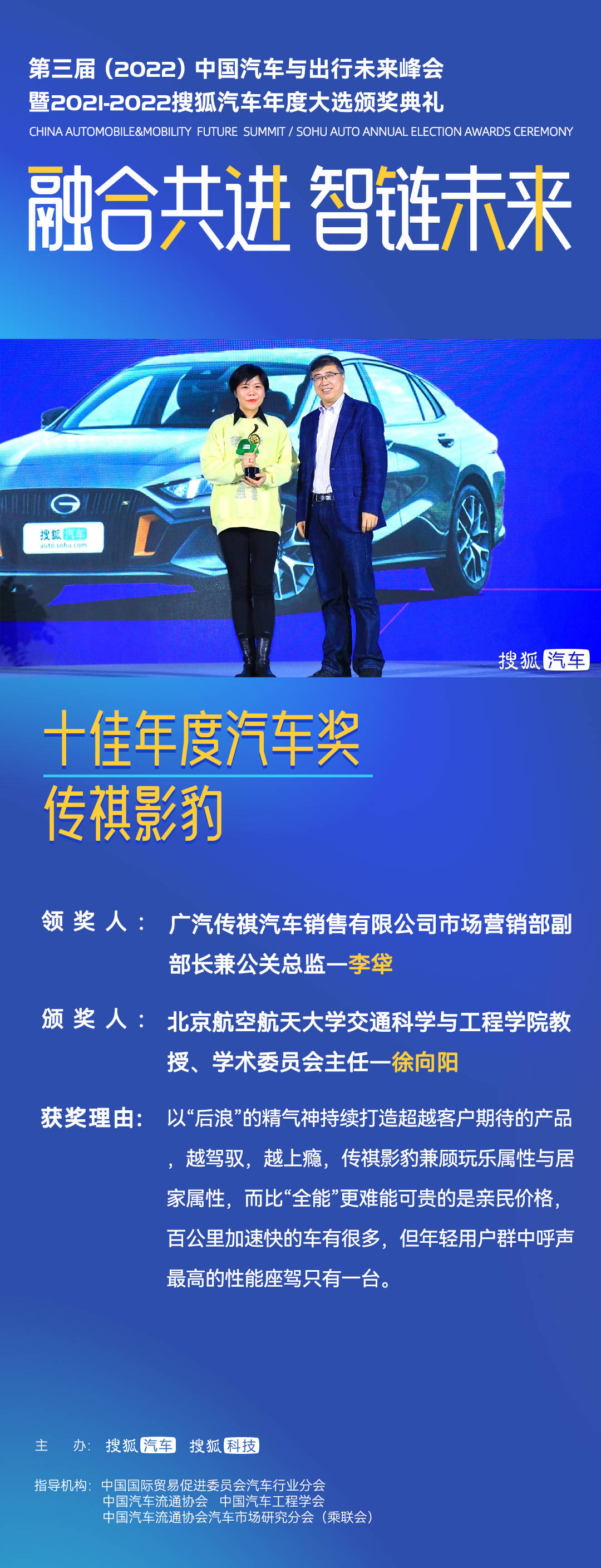 未来,“搜狐汽车年度大选”奖项将继续凭借专业的评审团队、全面的数据支撑以及极高的网友参与度,持续打造中国汽车行业最具影响力、最具权威性、最具指导价值的年度车型评选活动。大选将继续以优秀的企业与产品为载体,标记时代变革,持续见证中国汽车产业发展的历史进程!以下为“2021-2022搜狐汽车年度大选”获奖名单。