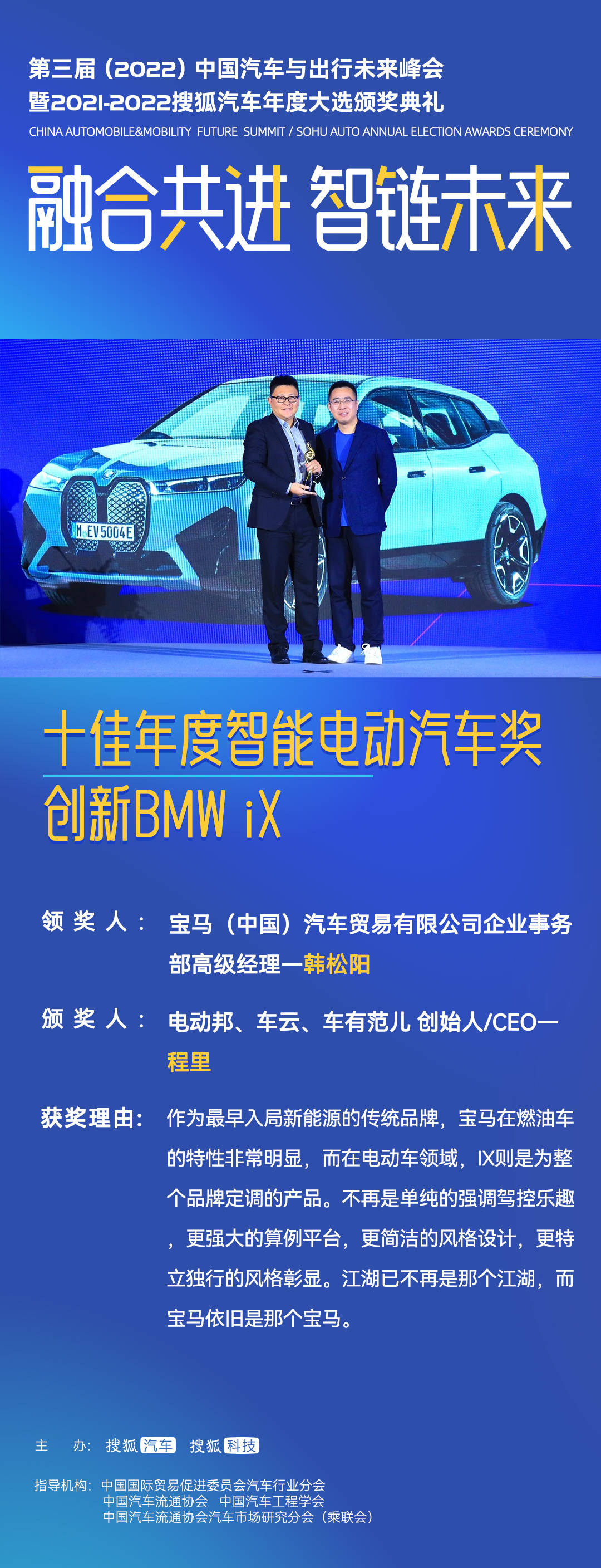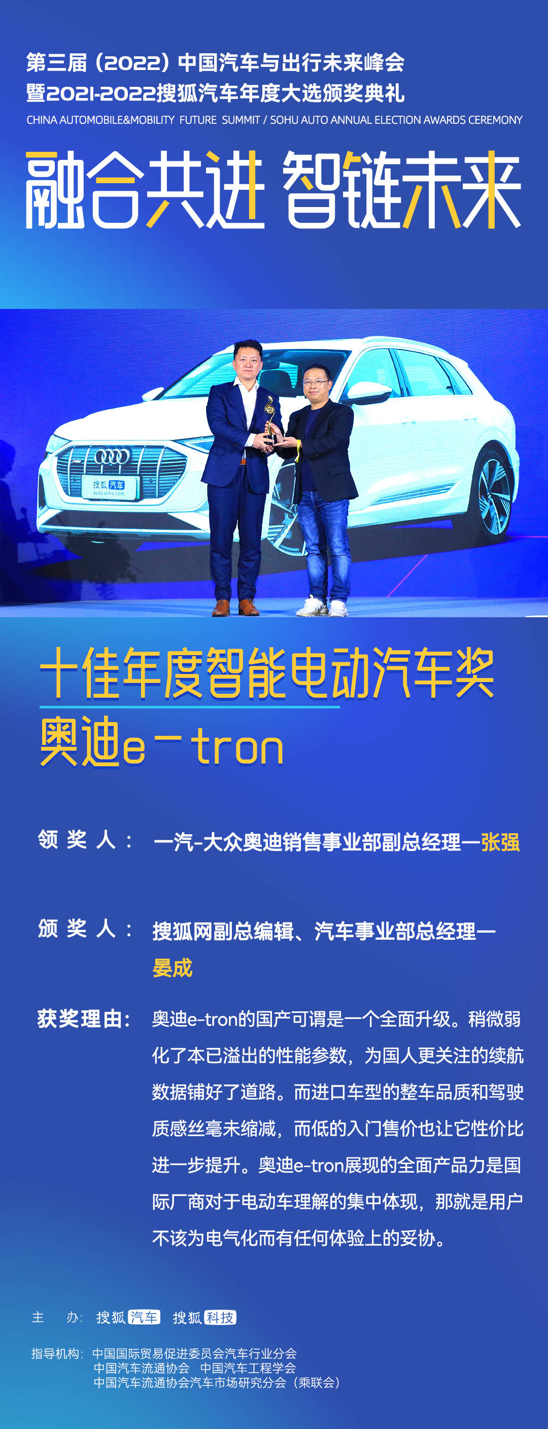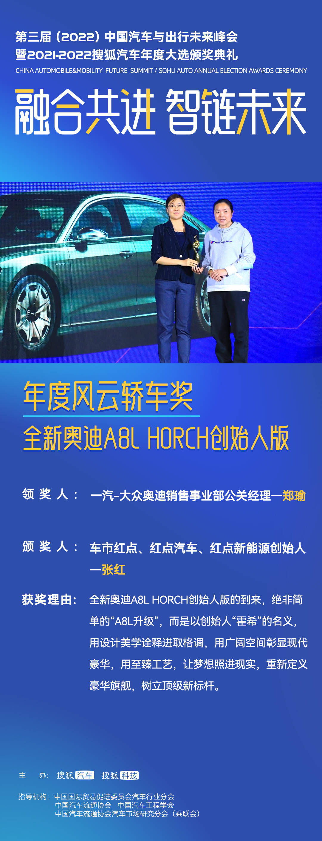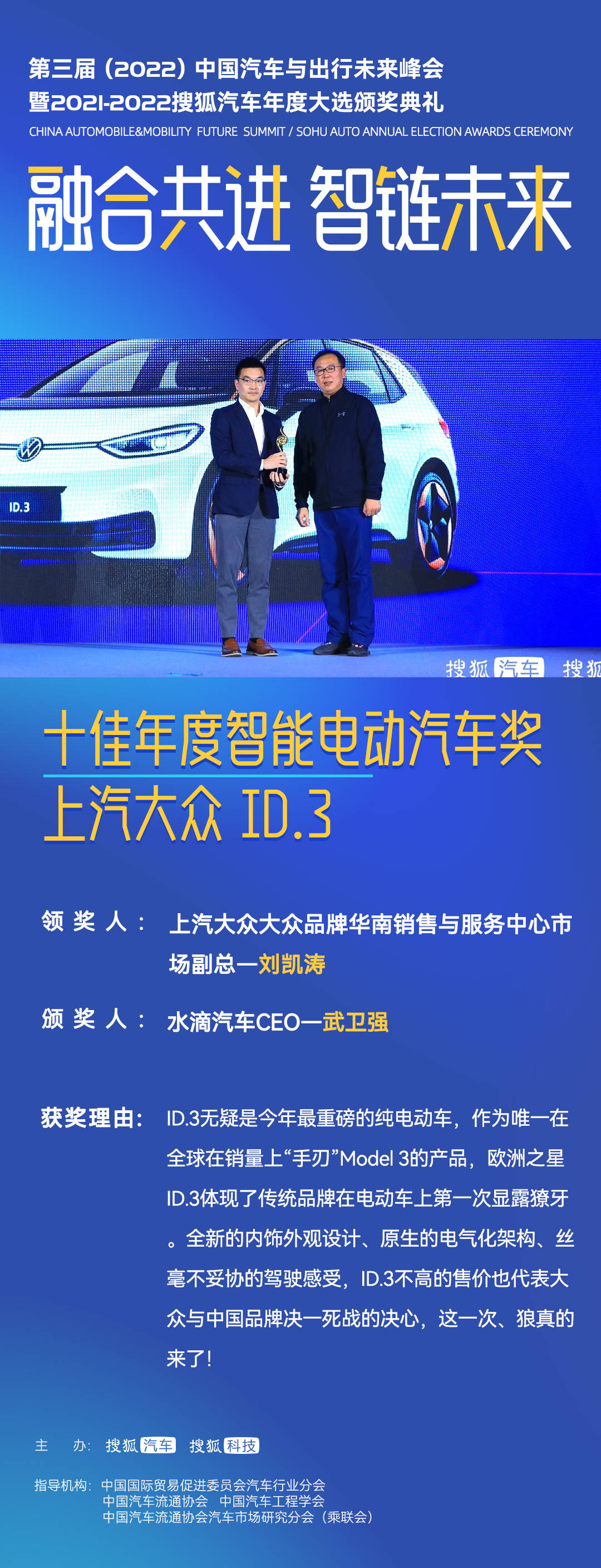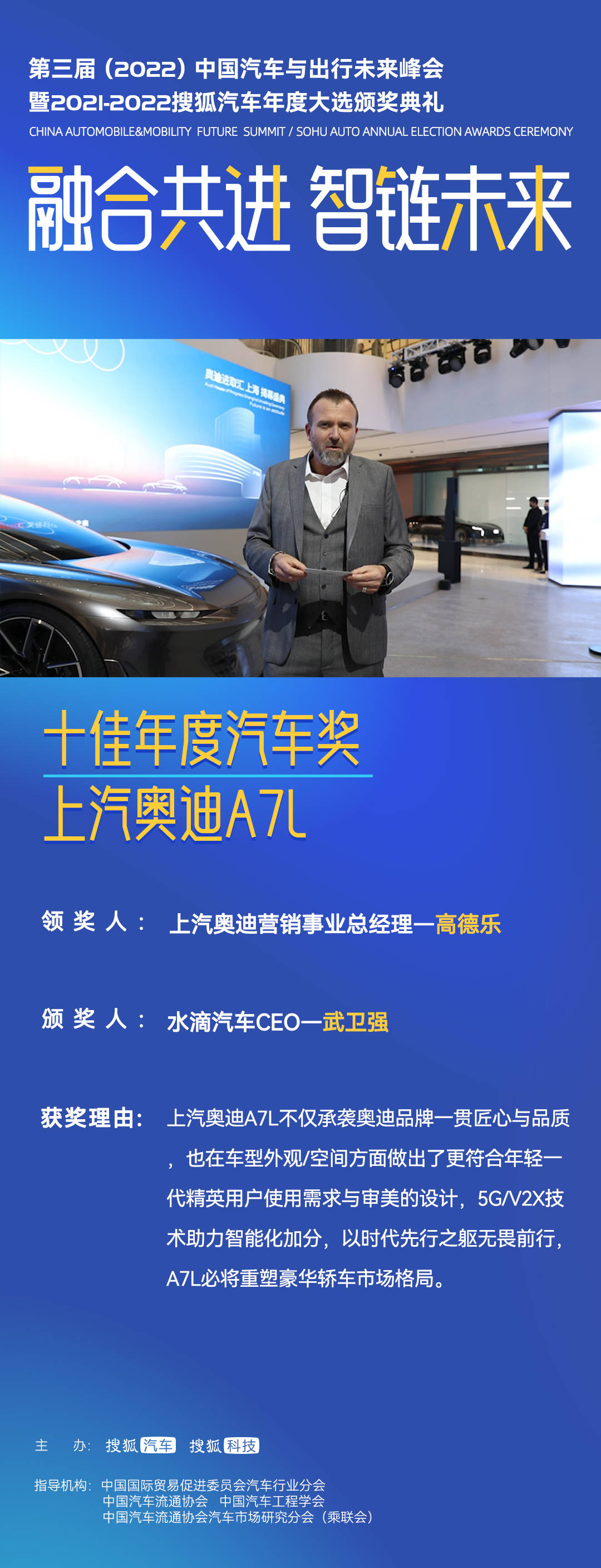 未来,“搜狐汽车年度大选”奖项将继续凭借专业的评审团队、全面的数据支撑以及极高的网友参与度,持续打造中国汽车行业最具影响力、最具权威性、最具指导价值的年度车型评选活动。大选将继续以优秀的企业与产品为载体,标记时代变革,持续见证中国汽车产业发展的历史进程!以下为“2021-2022搜狐汽车年度大选”获奖名单。