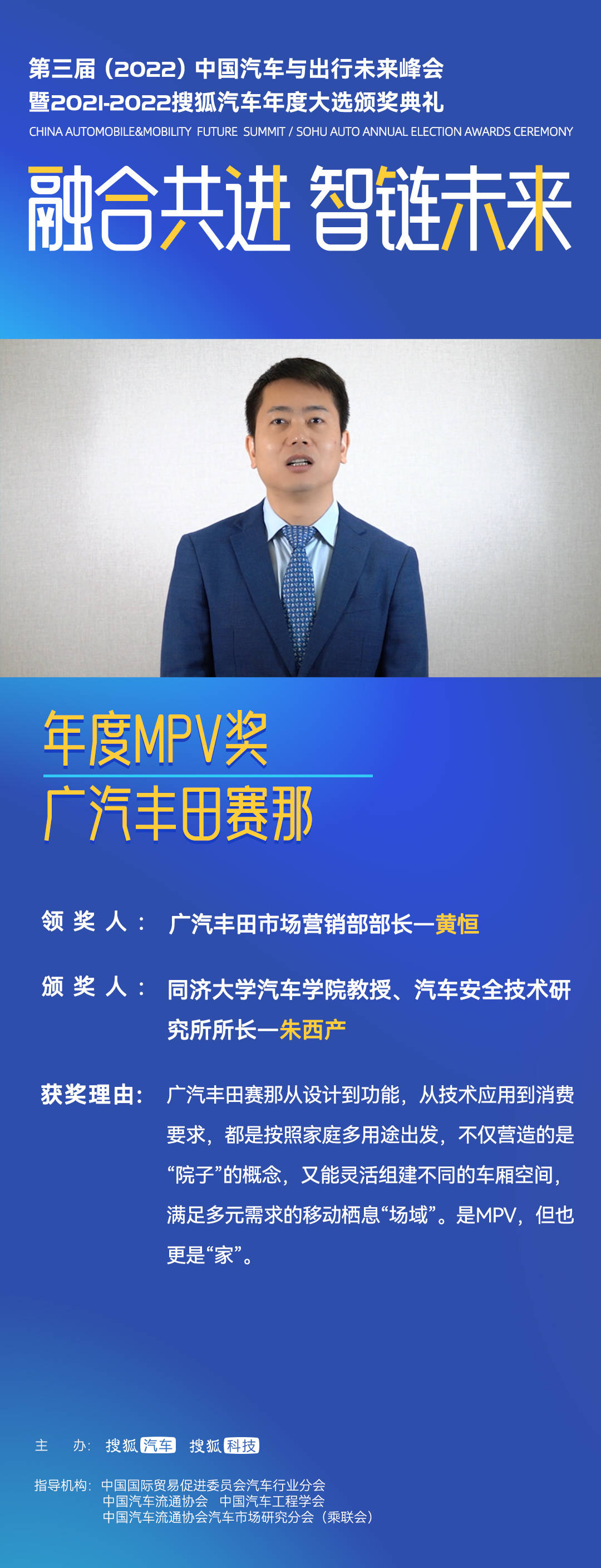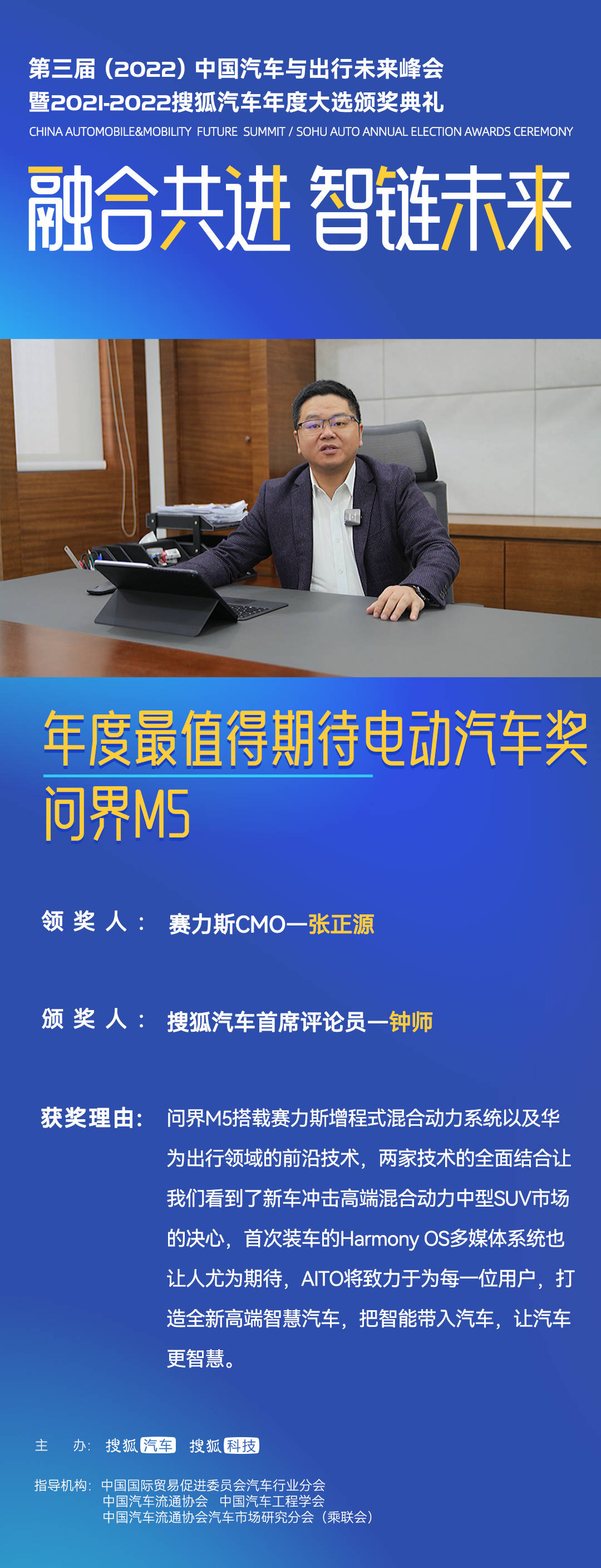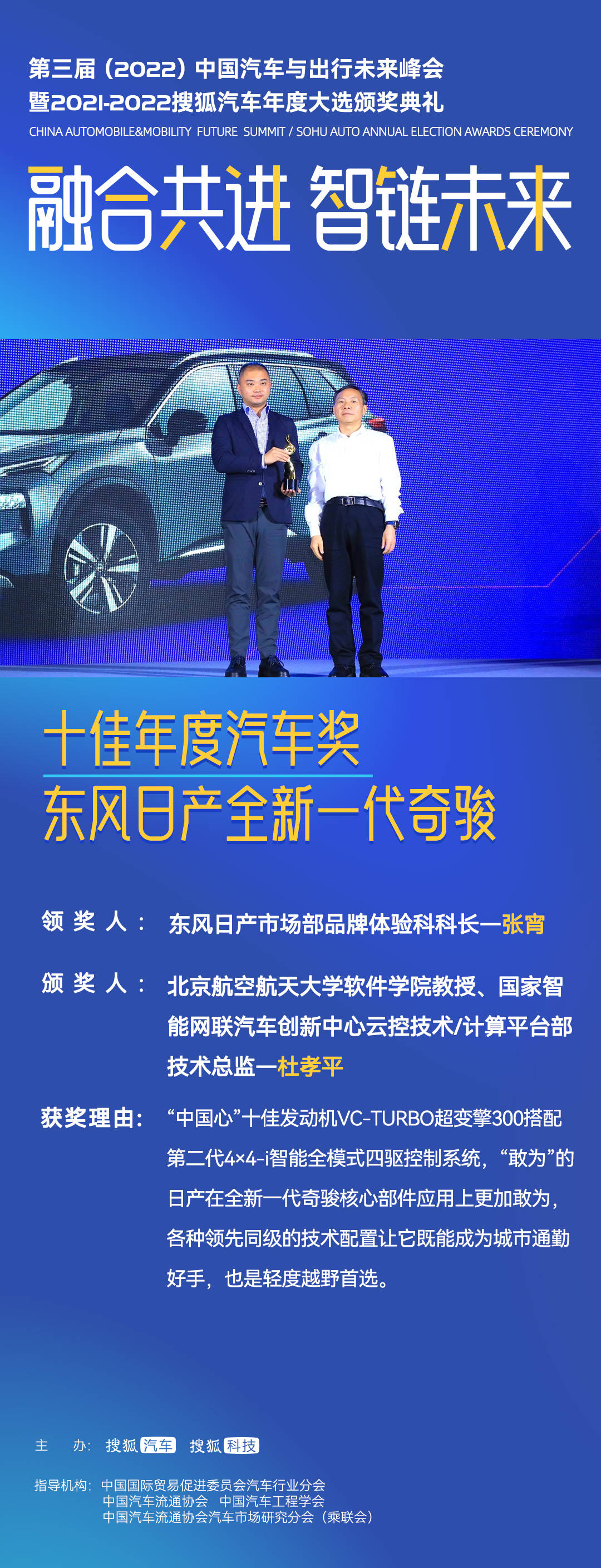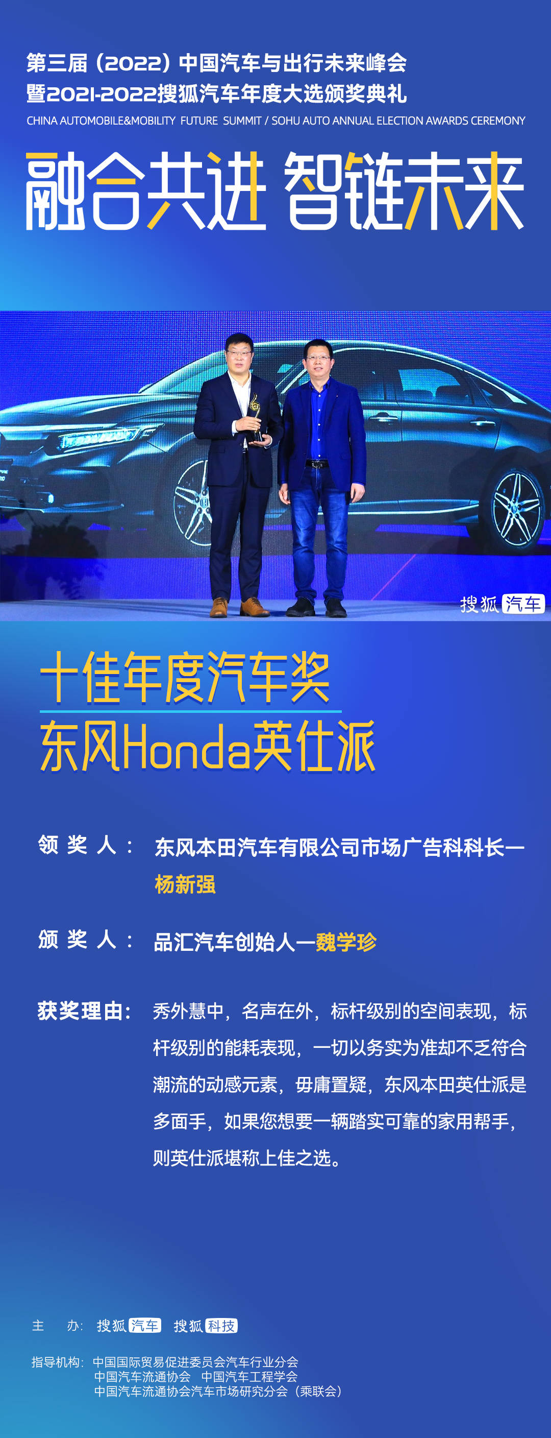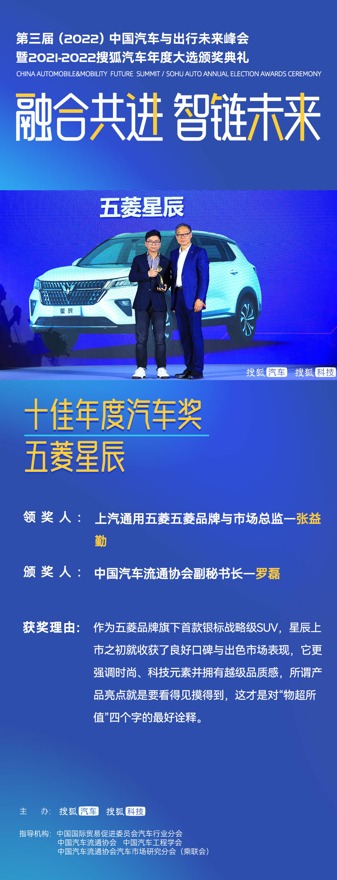未来,“搜狐汽车年度大选”奖项将继续凭借专业的评审团队、全面的数据支撑以及极高的网友参与度,持续打造中国汽车行业最具影响力、最具权威性、最具指导价值的年度车型评选活动。大选将继续以优秀的企业与产品为载体,标记时代变革,持续见证中国汽车产业发展的历史进程!以下为“2021-2022搜狐汽车年度大选”获奖名单。