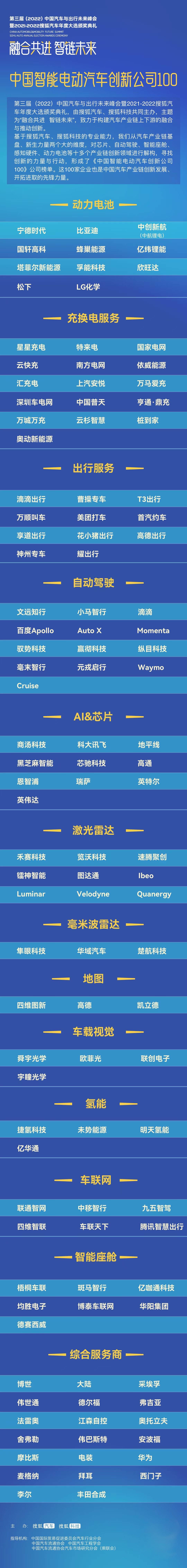 他特别在现场公布了《中国智能电动汽车创新公司100》榜单。据悉,此榜单是搜狐汽车从汽车产业链基盘、新生力量两大维度,对芯片、自动驾驶、智能座舱、感知硬件、动力电池等十多个智能电动汽车的产业链创新领域进行解构和数据分析,寻找产业创新力量与行动而形成的价值榜单。晏成认为,“企业用好的产品和服务与用户共振,媒体用好的内容与用户同频”,他最后说:“2022年中国汽车市场的前景令人充满期待,让我们共同携手助力中国汽车与出行行业再登新高峰。”