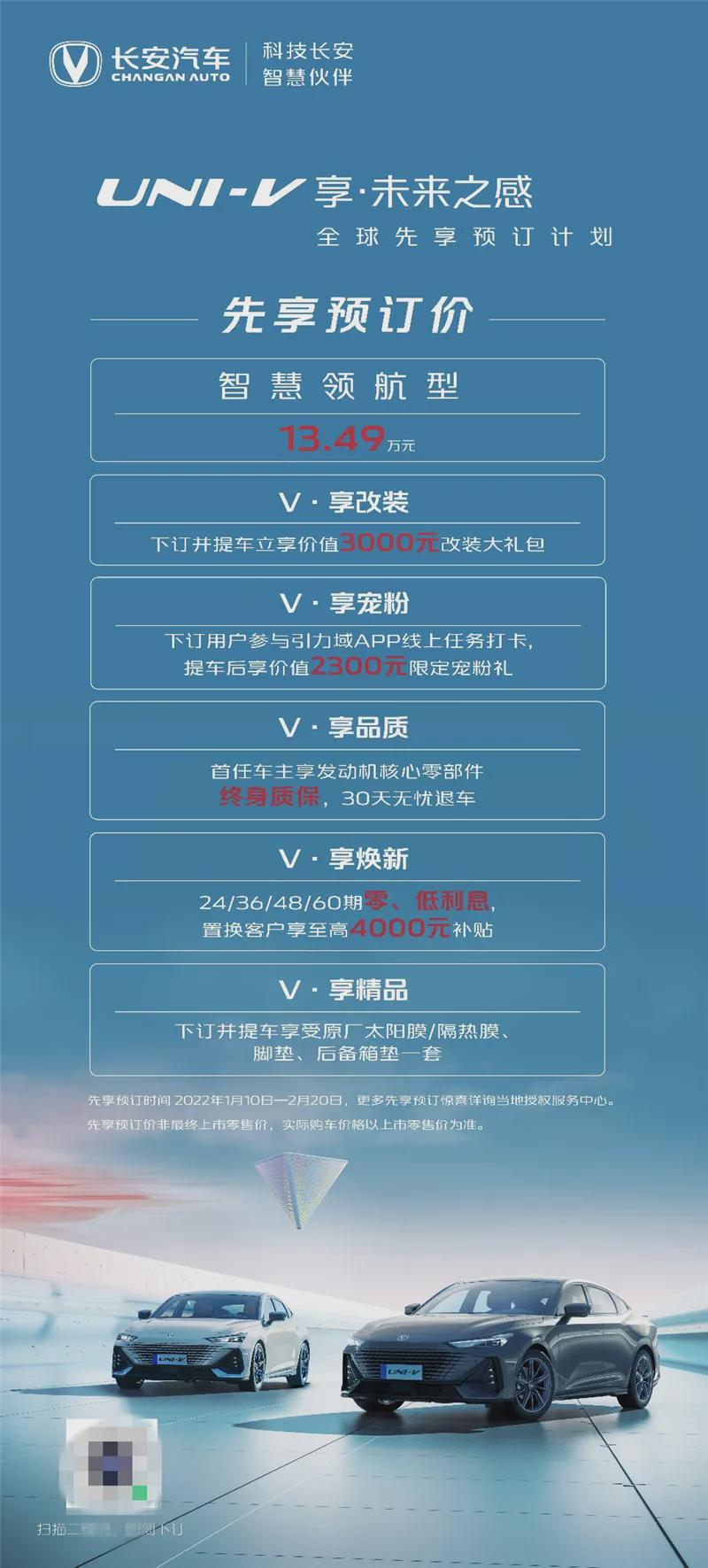 10月10日,长安UNI-V全球先享预订计划正式开启,官方发布1.5T顶配版本智慧领航型先享预订价13.49万元,下订用户在上市时可根据最终上市价格享受多退少不补尊享预订政策。同时,长安UNI-V更为用户带来多重先享预订礼,包括下订并提车用户立享价值3000元改装大礼包、下订用户参与引力域APP线上任务打卡,提车后享价值2300元限定宠粉礼、首任车主享发动机核心零部件终身质保,先享预订用户30天无忧退车、24/36/48期零、低利息,置换客户享至高4000元补贴以及下订并提车用户享受原厂太阳膜/隔热膜、原厂脚垫、原厂后备箱垫一套诸多专属礼遇,涵盖从购车到用车的各个环节,将全方位降低用户的购车成本,大幅提升用车时的舒适度。