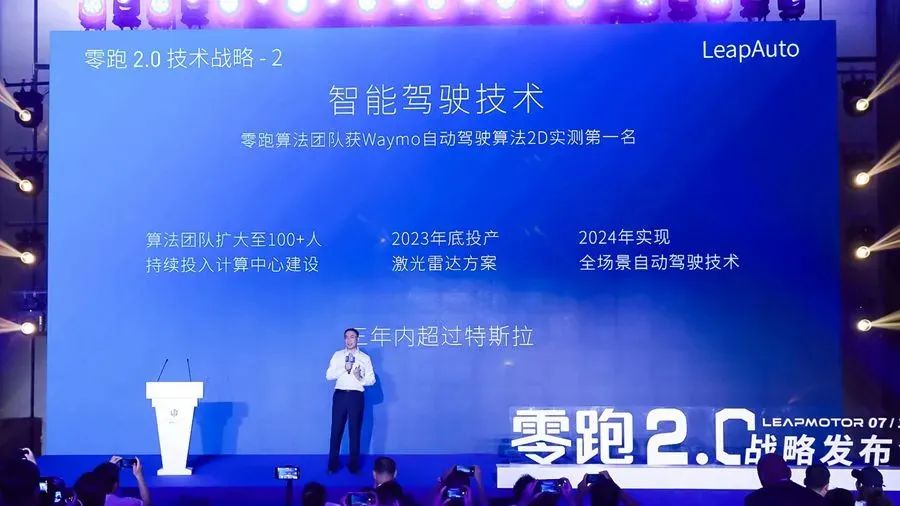 在2021年7月零跑汽车的2.0战略发布会上,朱江明不仅当着众多媒体说出了三年赶超特斯拉的豪言壮语,还在大屏上打出了这几个字眼。