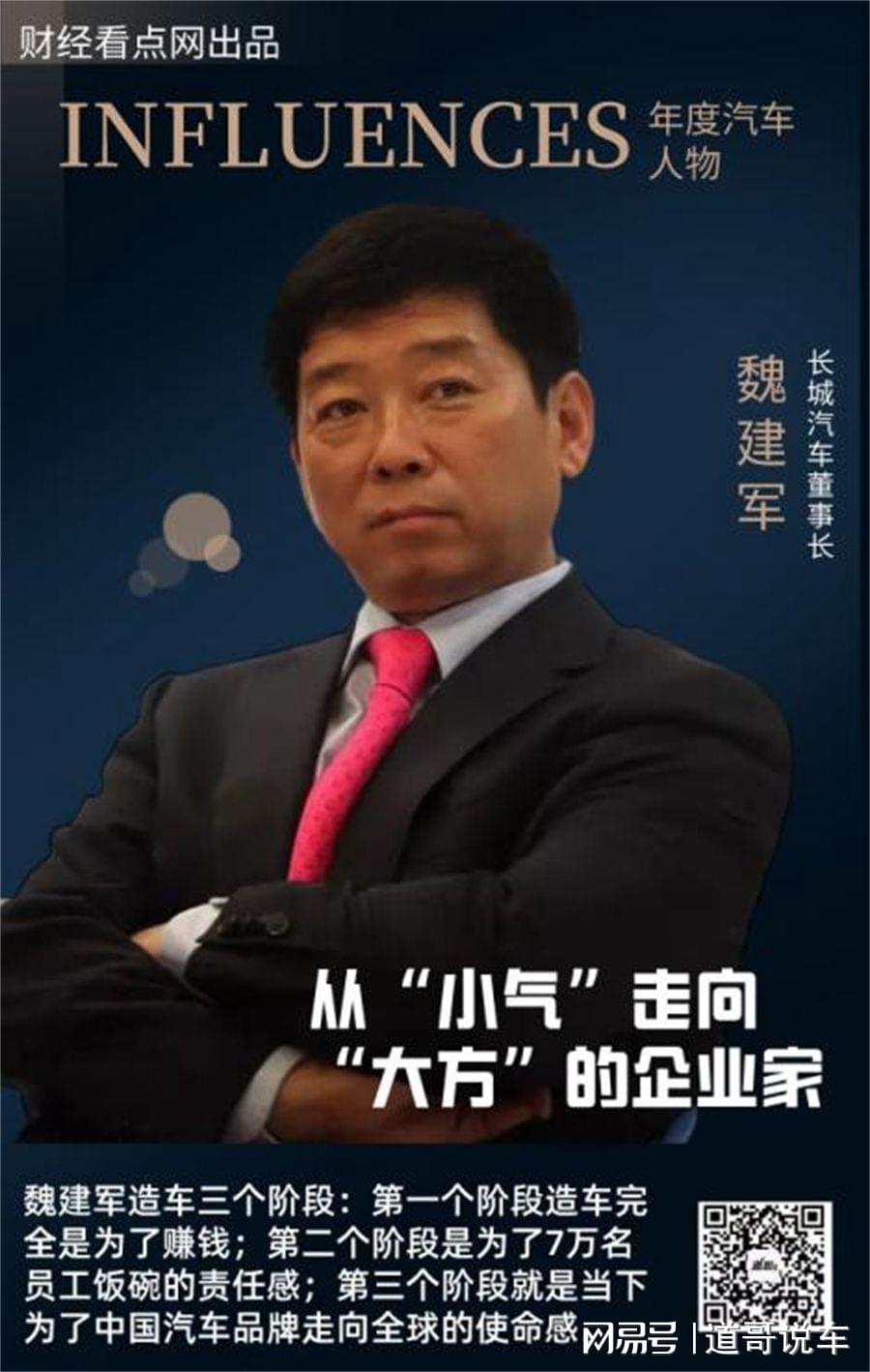 熟悉魏建军的长城汽车高管对《财经看点网》旗下道哥说车编辑表示,魏建军对于造车的认识有三个阶段:第一个阶段造车完全是为了赚钱;第二个阶段是为了7万名员工饭碗的责任感;第三个阶段就是当下为了中国汽车品牌走向全球的使命感。