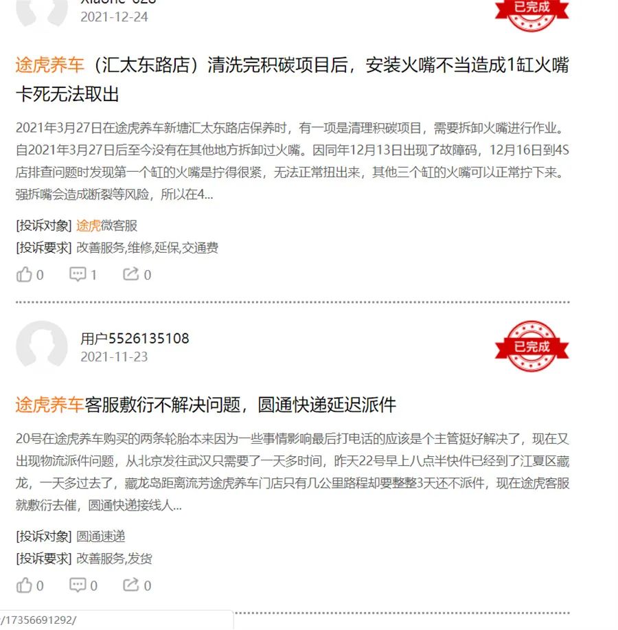 而在消费类投诉网站黑猫投诉中,关于途虎养车保养水平,服务态度,消费欺诈配件质量等方面的投诉也并不少见,比如“途虎养车清洗完积碳项目后,安装火嘴不当造成1缸火嘴卡死无法取出”,“途虎养车客服敷衍不解决问题,圆通快递延迟派件”,“不到2年,在北京路面行驶2万公里,著名的德国马牌轮胎居然要报废”……而这些是否与途虎养车“维保便宜”的人设相关呢?