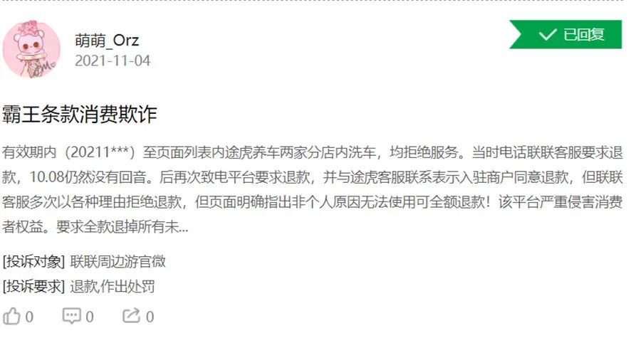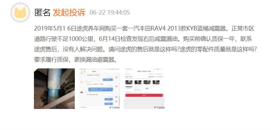 据了解,途虎养车虽是国内汽车后市场最知名的线上线下一体化汽车服务平台之一,却也并不完美,曾经深陷“假机油事件漩涡”,甚至被用户以拉横幅方式维权,值得一提的是,在铺天盖地的“买四送一”轮胎福利之外,“88元”机油也一向是途虎养车的热点福利。此外,在消费类投诉平台中,实际上关于途虎养车的投诉也并不少见。