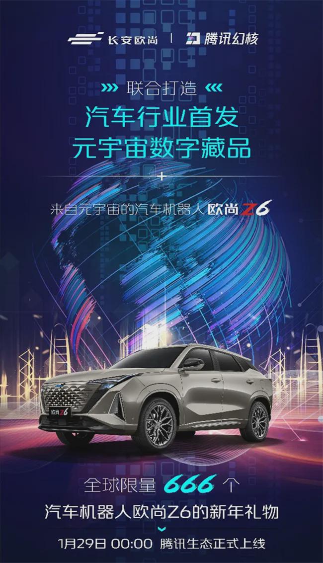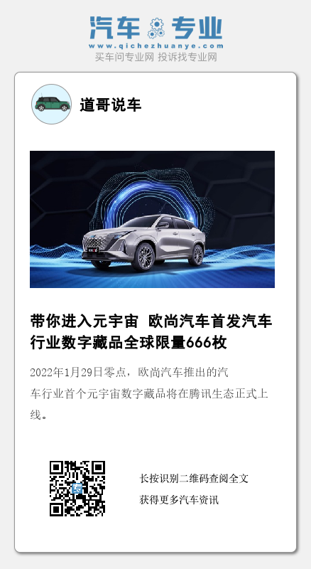 2022年1月29日零点,由欧尚汽车和腾讯幻核联合推出的汽车行业首个元宇宙数字藏品将在腾讯生态正式上线,面向所有群体抽取,全球限量666枚。