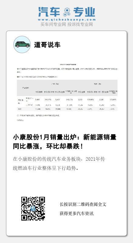 2月9日晚,小康股份发布1月产销数据情况,小康股份1月份汽车销量为20762辆,同比增长2.42%,环比减少27.1%。其中新能源汽车销量为3520辆,同比增长176.08%,但是环比2021年12月份骤降42.76%,其他车型的销量为17242辆,同比减少9.23%,环比则减少22.78%。