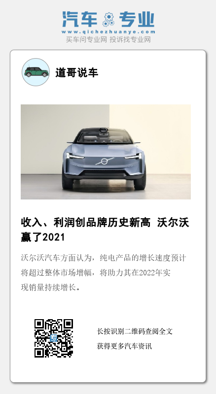 据了解,随着沃尔沃汽车在夏季后将纯电产品的年产能提高到15万辆,纯电产品在总销量中的份额将继续增长,就2022年全年而言,沃尔沃汽车预计这一份额将比2021年全年增加一倍以上。沃尔沃汽车方面认为,纯电产品的增长速度预计将超过整体市场增幅,将助力其在2022年实现销量持续增长。