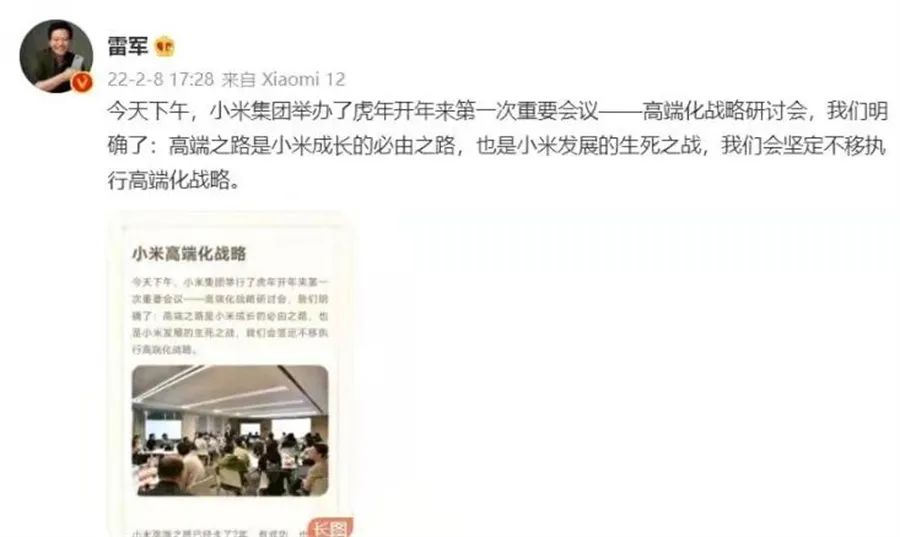 除了养汽车,小米再度宣誓将自己的老本行手机业务从“高性价比”转型为“高端化”,尽管早已打出了“高端化”的旗号,但是在高端化实践上,过去两年,小米高层似乎并不坚定,如今,小米集团正式组建高端化战略工作组,称三年内拿下国产高端手机市场份额第一。