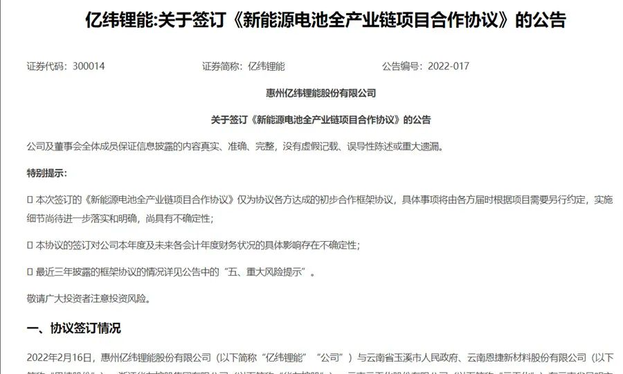 2月16日晚,亿纬锂能发布公告称,与云南省玉溪市人民政府、云南恩捷新材料股份有限公司、浙江华友控股集团有限公司、云南云天化股份有限公司在云南省昆明市签订《新能源电池全产业链项目合作协议》。