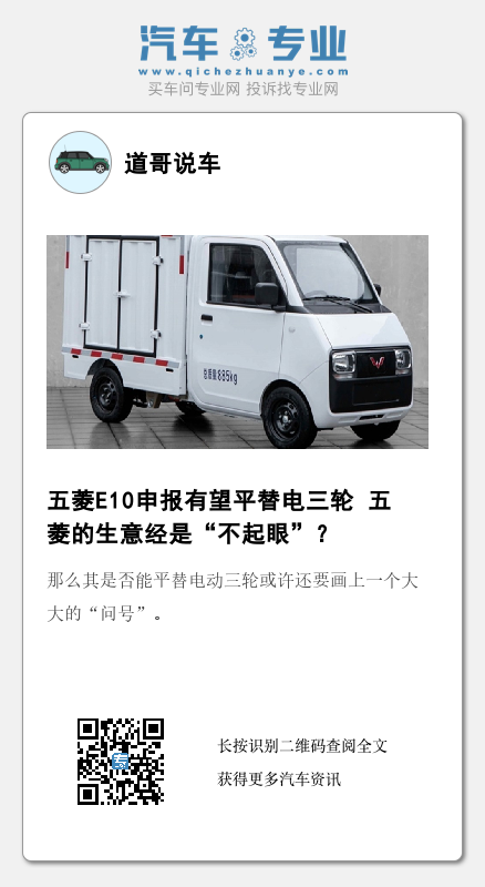 值得关注的是,从宏光MINI EV到本文的主角五菱E10,五菱似乎正在努力开发其他车企看不到的市场,从抢老头乐生意成功的案例看,五菱E10未必不会成为电动三轮的最大竞争对手,尽管这中间还有很多不确定。