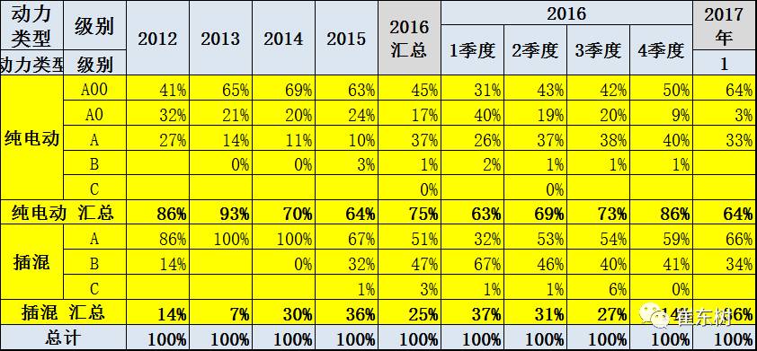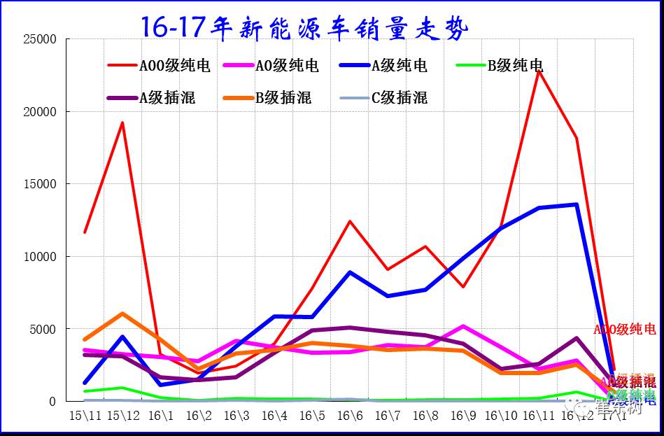 纯电动中的A00级电动车有0,2万台,仍是最大的市场,同比下降32%。A级电动车主要是北京市场的拉动,因此去年的年初销量仍较低,今年的1月的A级电动车同比持平,但环比12月也是下降了91%。插电混动的市场总体低迷,A级插混甚至低于15年1月的销量。但这也是正常的过渡期,不必过分解读销量下滑问题。