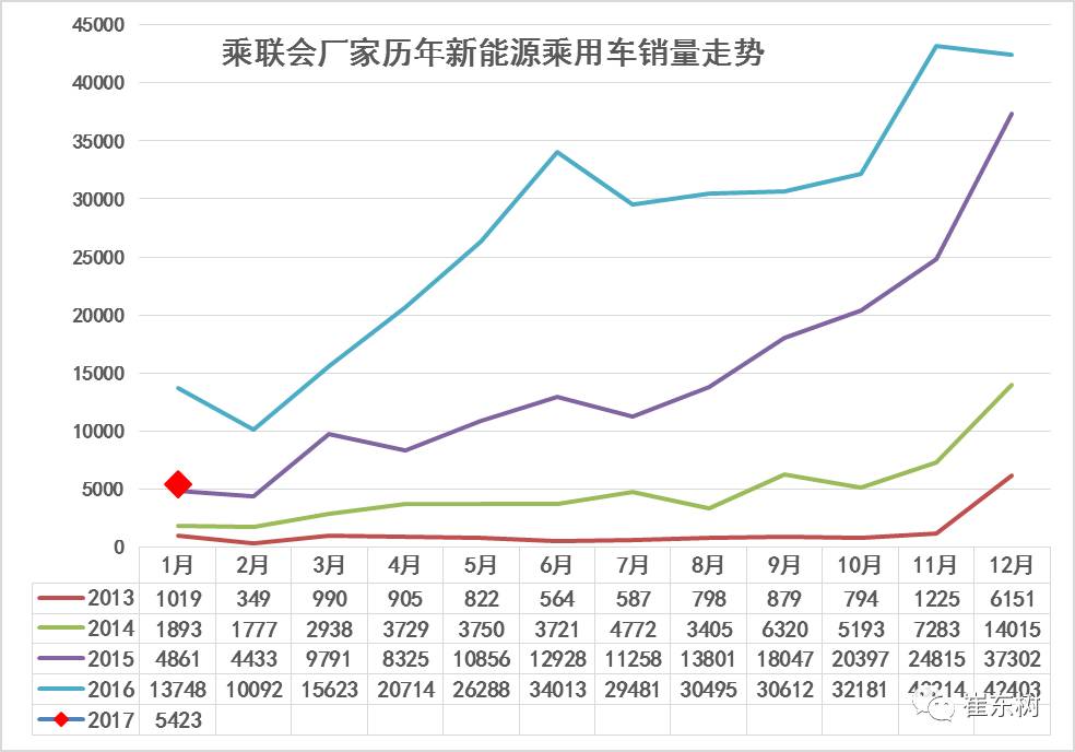 在15年新能源车高增长后,16年新能源乘用车市场呈现调整规范发展的特征。16年上半年的3-6月新能源车逐步实现恢复性增长,6月冲刺到3.5万台水平。下半年的7-10月新能源车处于3万台左右的位稳定状态调整整固。16年11-12月的新能源车达到4.2万台高位。17年1月0.54万台体现了市场对政策补贴的极度依赖,随着第一批目录的发布,2月新能源车市场产销将大幅高于1月。