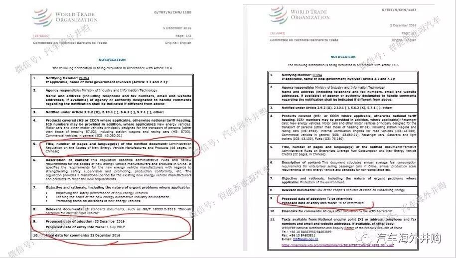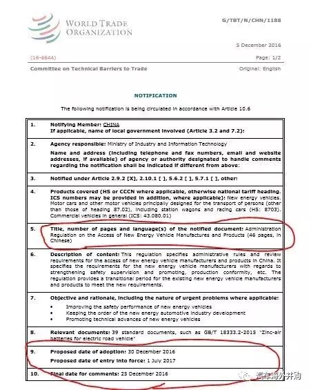 2016年12月11日是中国正式加入世界贸易组织WTO的十五周年纪念日。此前一周的2016年12月5日,中国正式将两项涉及中国新能源汽车行业发展至关重要的两项法规《企业平均燃料消耗量与新能源汽车积分并行管理暂行办法(征求意见稿)》(简称《CAFC+ZEV办法》)和《新能源汽车生产企业及产品准入管理规定(草案)(简称《新能源准入》)提交世界贸易组织技术性贸易壁垒协定委员会(WorldTrade Organization/ Committee on Technical Barriers to Trade,WTO/TBT)进行通报。