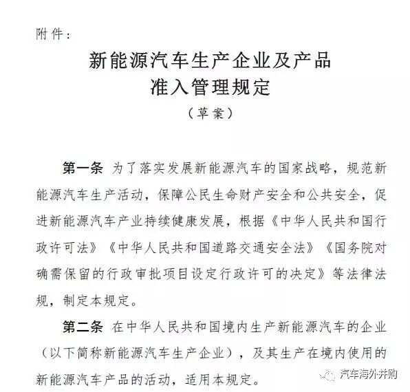 《新能源准入》的通报文件显示,中国即将实施的《新能源准入》内容规定了中国境内新能源汽车生产企业及产品准入的管理办法及审查要求,强调了中国境内新能源汽车生产企业加强安全监管、产品生产一致性等方面的要求,对现有新能源汽车生产企业和产品设定了达到新的规则要求的过渡期。《新能源准入》实施的目的是“提高新能源汽车的安全性能,规范新能源汽车产业发展秩序,以及推动新能源汽车技术进步,”相关文件是GB/T18333.2-2015《电动道路车辆用锌空气蓄电池》等39个标准文件。本法规拟批准的日期是2016年12月30日,拟生效的日期是2017年7月1日。本法规的意见反馈截止日期2016年12月25日。如果各国有意见和建议,可以反馈到位于国家质检总局的中国WTO/TBT国家通报咨询中心。