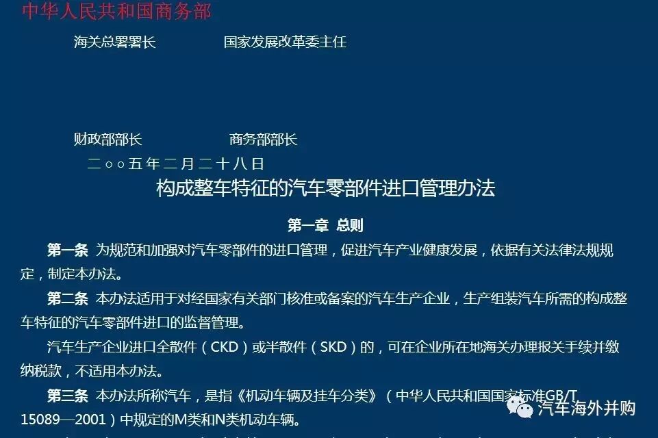 说道提交WTO通报,不仅让人联想到十一年前的2005年4月中国开始实施《构成整车特征的汽车零部件进口管理办法》(简称《整车特征》),该办法规定如果用进口全散件、半散件组装汽车,或进口车身或其他一些总成(系统)装车、或者进口零部件价格综合达到整车总价格的60%及以上的,即被核定为构成整车特征的进口零部件。中国对进口汽车零部件征收10%的关税,但如果价值超过整车的60%后,税率就将调升至25%左右。