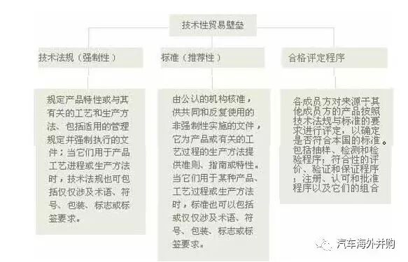 《汽车海外并购》和《智能新能源汽车》了解到,就目前来看,国际贸易中各国反应最强烈的基本上还是四类贸易壁垒:绿色壁垒、安全壁垒以及信息技术壁垒,包装和标签,他们或者以标准的形式出现,或者以技术法规的形式,或者以合格评定、检验检疫的形式出现,还有以计量单位制、物品编码、商品的品种、规格、花色、款式和其他外观要求、国家和地区不同的风俗习惯等来达到限制进口、保护本国产业的目的。