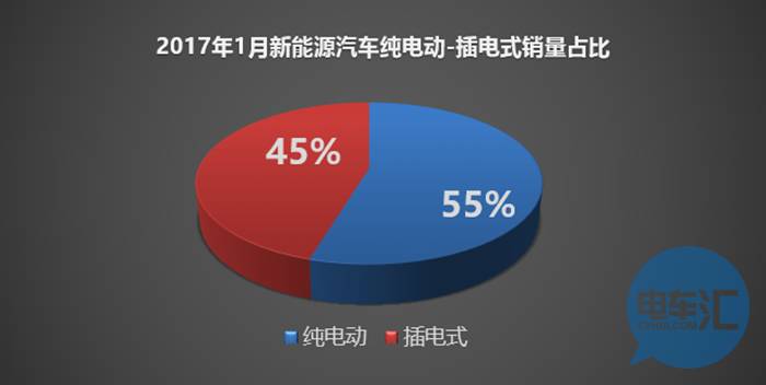 电车汇消息:日前,乘联会公布了国内新能源乘用车销量:17年1月新能源乘用车销量达到5423台,总体同比增速-61%,其中,纯电动乘用车销3463台,同比增-55%;插电式乘用车销1960台,同比增-67%。