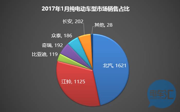 在公布的纯电动车型数据中,北汽的四款纯电动车型1月销量共计1621台,占到接近一半的比例,其中北汽EU系列市场变现不错,显然与今年元旦前后北汽在政策尚不明朗的情况下宣布全系车型不涨价有关。公布的江铃两款微型车销量达1125台,应证了微型车在市场结构中的地位。除此之外,其他数家车企均只公布了一款车型的销量,因此占比较低。其中长安奔奔202台,众泰E200销186台,奇瑞eQ电动车销182台,比亚迪e6销119台。